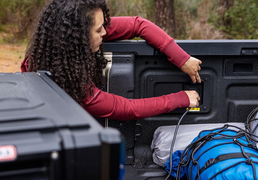 Take the convenience of electricity with you, wherever you go. Enjoy up to 400 W of power directly from your truck's in-cab and in-bed outlets with this available feature.
